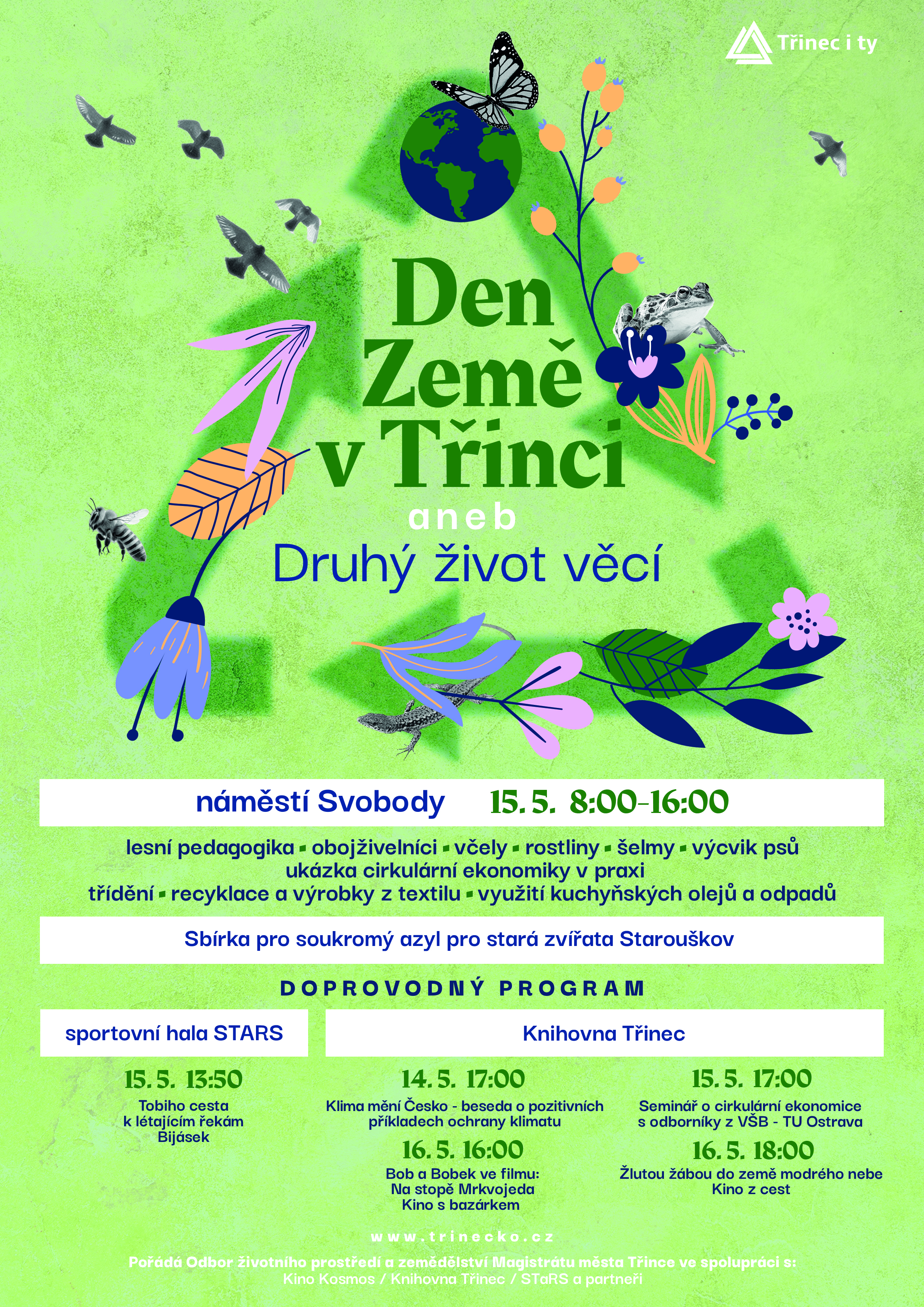 Letos se účastníme Dne Země v Třinci a bude to ve velkém stylu. Akce se bude konat ve čtvrtek 15. května na náměstí Svobody v Třinci a v prostorách kulturního domu Trisia. Den Země bude trvat celý den, čili od 8 do 16 hodin, aby se mohli na náměstí Svobody podívat i ti zájemci o ochranu přírody a ekologii, kteří jsou dopoledne v práci. Téma ochrany životního prostředí je rozšířeno o velice aktuální téma – cirkulární ekonomiku.